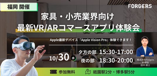 多くの家具・小売業者にVR/AR SaaSを提供中の(株)Forgersが、2024年10月30日(水)に福岡にて、Vision Pro・Quest 3のコマース向けVR/ARデモアプリ体験会を開催します