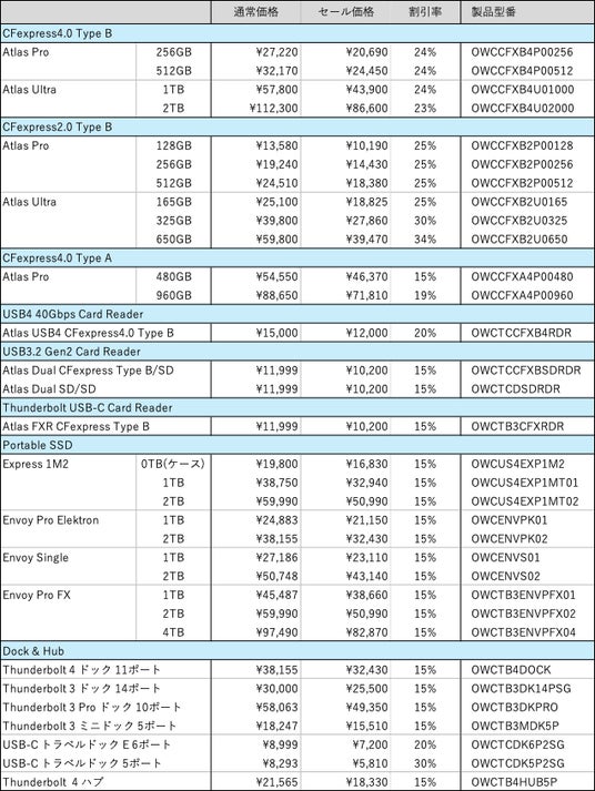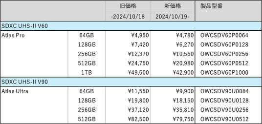 OWC Atlas Pro/UltraシリーズSDXC UHS-IIカードの価格改定を実施いたします。また同時にOWC製品を10/19-20の2日間セール価格で販売いたします。
