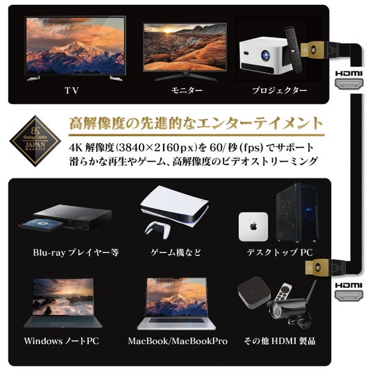 - 対応デバイス:HDMIポートを採用する各種パソコン、ディスプレイ、テレビ、AVアンプ、Blu-rayレコーダー、Nintendo Switchなどゲーム機器、ホームプロジェクターなど、幅広い製品に対応
