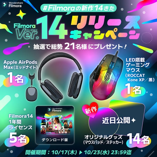 【 Filmora Ver.14 】リリースキャンペーン実施中!動画編集が捗るAirPods Max/光るゲーミングマウス、オリジナルマウスパッドなど抽選で総勢21名様にプレゼント