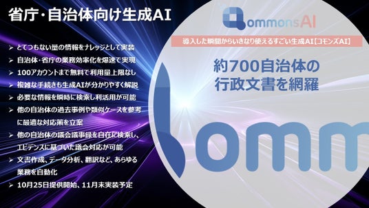 導入した瞬間からいきなり使えるすごい生成AI【コモンズAI】がとてつもない量の情報をナレッジとして実装!約700の自治体の行政文書を網羅し、省庁や自治体の職員は爆速で業務効率化を実現!
