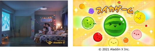 「Aladdin X2 Light」はLEDシーリングライト、高音質スピーカー、高性能プロジェクターを搭載した照明一体型3in1プロジェクターです。天井に設置することでスペースの有効活用ができ、手軽に自宅で迫力の大画面を楽しめます。壁からの距離が短くても大画面を実現するレンズ、フルHDの解像度、そしてオーディオメーカーHarman Kardon製のスピーカー8Wを2基搭載しています。加えて、Aladdin OS搭載でインテリア、キッズ、ヘルスケアなどのオリジナルコンテンツを提供し、日常に寄り添うソフトウェア設計になっています。累計1,100万ダウンロードを突破した「スイカゲーム(R)」もAladdin Xのオリジナルコンテンツが発祥です。