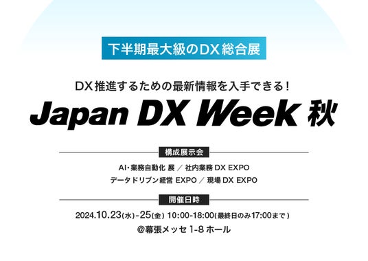 Japan IT Week 秋の一環として開催されるJapan DX Weekに出展します。 当社ブースでは、最新のデジタルトランスフォーメーション技術や事例を紹介し、企業のDX推進に役立つソリューションを展示します。AI、IoT、クラウドなど、幅広い分野の最新技術が一堂に会するこの機会に、ビジネス革新のヒントを得ることができます。DXに関心のある経営者や技術者の皆様、ぜひ当社ブースにお立ち寄りください。