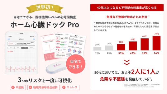 不整脈のひとつである心房細動は致死的なリスクを伴いながらも、自覚症状がないことが多く、一般的な健康診断や短時間の心電図検査では見逃されることが多いという課題があります。ココロミルの「ホーム心臓ドック(R)」は、長時間にわたる心電図計測が可能で、心房細動の発見率を大幅に高めることができます。