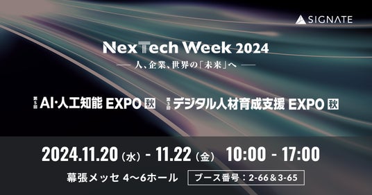 企業のDX推進を支援する株式会社SIGNATE(本社:東京都港区、代表取締役社長:齊藤 秀、以下「SIGNATE」)は、2024年11月20日(水)から22日(金)に幕張メッセにて開催される「NexTech Week 2024 秋」に出展いたします。SIGNATEは、AI・人工知能EXPOおよびデジタル人材育成支援EXPOの2つのエリアにてブースにて、生成AIを活用した業務改革と人材育成の取り組みを紹介します。