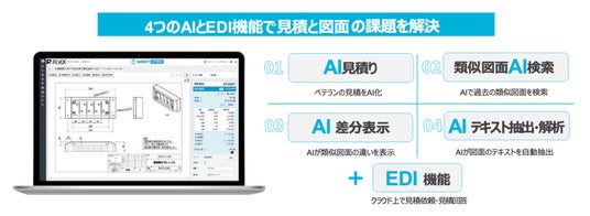 すぐに、だれでも、カンタンに、製造業のDXを推進するクラウドサービス。「AI見積り」「類似図面AI検索」「AIテキスト抽出・解析」「AI差分表示」の4つのAIを通じ見積・受注・調達・設計業務における様々な課題を解決します。使えば使うほどAIが賢くなり、経験と勘に頼りがちな業務フローを変革します。