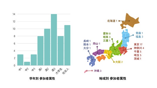 総勢58名(中学生7名、高校生32名、大学生・社会人19名)にご参加いただきました。オンライン開催時は特に全国各地から集まり、多様なバックグラウンドの方が一堂に会する場となりました。また、まちづくりにおける視点を増やし、議論を深まるため、大学生・社会人の方も募集しました。
