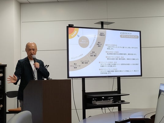 積水ハウスの藤原さんから積水ハウスの「まちづくり憲章」と「まちづくりの4つの視点」をテーマとして、環境マネジメント、生活マネジメント、経済マネジメント、タウンマネジメントの4つの視点についてレクチャーしていただきました。各視点に関して、事例も取り上げながら具体的に紹介してくださいました。