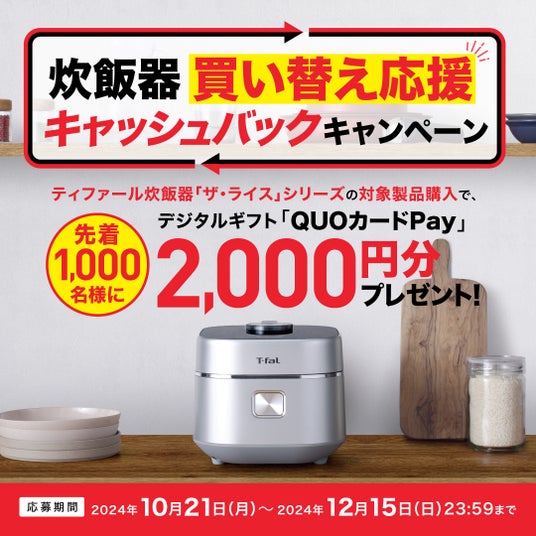 株式会社グループセブジャパン(本社:東京都港区/代表取締役社長:アンドリュー・ブバラ)は、2024年10月21日(月)から、ティファールの炊飯器「ザ・ライス」シリーズの対象製品を購入された方を対象にキャッシュバックキャンペーンを実施いたします。
