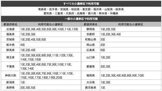 全国35都道府県・200選挙区以上で利用可能に。青森/岩手/宮城/秋田/東京/福井/山梨/岐阜/愛知/三重/大阪/兵庫/香川/熊本/沖縄は全区でその他20道府県でも一部選挙区で利用可能に。エリア拡大へ