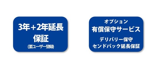 保証期間は安心の3年保証(センドバック保守)。さらにユーザー登録いただいたお客様限定で2年間の延長保証(合計5年間)をいたします。