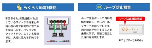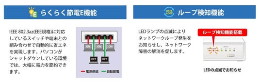 また、ループが発生した場合の対策として、法人向けタイプの“EHB-UG2C0x-Sシリーズ”では、ループが発生したポートを自動的に閉鎖し、LEDとブザーでお知らせします。汎用タイプの“EHC-G0xMN4-HJシリーズ”では、LEDの点滅によりループの発生を通知します。
