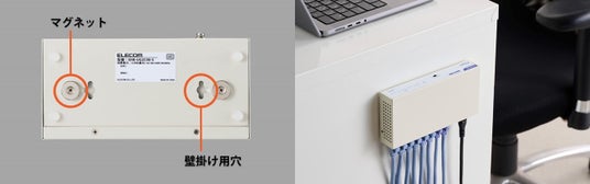 ▲ 底面にマグネットと壁掛け用穴を装備 ▲ マグネットにより金属面に設置可能