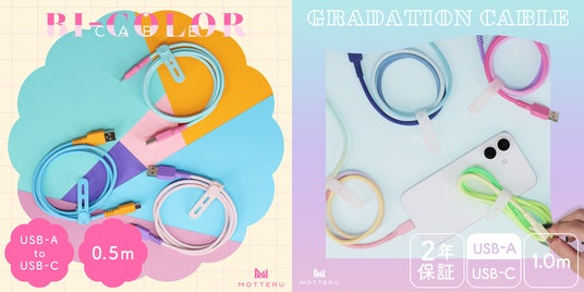 株式会社MOTTERU(モッテル)(本社:神奈川県海老名市、代表取締役:櫻田良太)は、全国の家電量販店、雑貨店やMOTTERU公式オンラインショップなどで人気のグラデーションケーブルに新色のアクア / メロンクリームソーダ の2色を追加します。また、先行で店舗限定販売していたバイカラーケーブル1.0mの2色にMOTTERU公式オンラインショップなどの限定としてカラーバリエーションにオレンジソーダを追加、ケーブルの長さにコンパクトサイズな0.5mを追加して新発売します。