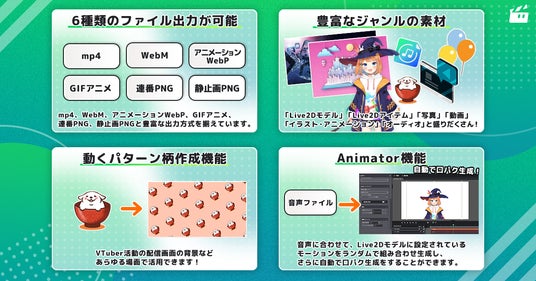 当社のフェイストラッキングアプリ「nizima LIVE」と連携した動きのレコーディング、モデルをはめ込んで多彩な表現が可能な「Live2Dテンプレ機能」など、あなたの動画を彩る機能が充実!