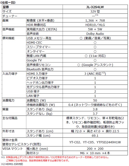 ナーレスGoogle TV」で、今回新たにラインアップされるJL-32S4LW はホワイトカラーの32V