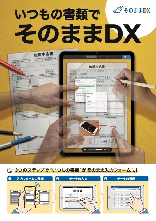 「日本のシステム導入の文化を変えて、世界一簡単なDXを実現する」の目的の元、既存の書類がそのまま入力フォームになり、各種データベースとも連携できるシステム「そのままDX(旧:Photolize)」を提供しています。