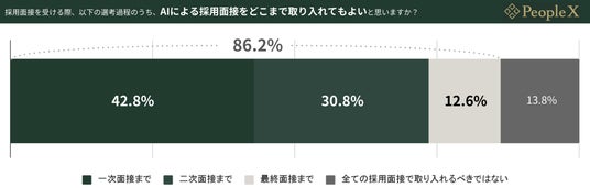 同じく採用面接経験者に、「採用面接を受ける際、以下の選考過程のうち、AIによる採用面接をどこまで取り入れてもよいと思うか」質問したところ、「一次面接まで(42.8%)」「二次面接まで(30.8%)」「最終面接まで(12.6%)」「全ての採用面接で取り入れるべきではない(13.8%)」となり、86.2%が一次面接はAIによる採用面接を取り入れても良いと考えていることがわかりました。