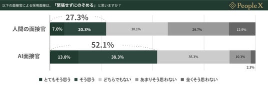 続いて、人間の面接官による採用面接は「緊張せずにのぞめる」か質問したところ、「とてもそう思う(7.0%)」「そう思う(20.3%)」の合計が27.3%、AIの面接官では、「とてもそう思う(13.8%)」「そう思う(38.3%)」の合計が52.1%となりました。これにより、人間よりもAIの面接官のほうが「緊張せずにのぞめる」という結果となりました。