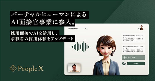 エンプロイーサクセス事業を推進する株式会社PeopleX(本社:東京都渋谷区、 代表取締役CEO:橘 大地、以下:当社)は、バーチャルヒューマンを活用したAI面接官事業に参入することをお知らせいたします。なお、この度の取り組みはAiHUB株式会社との協業となります。