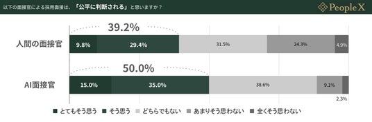 採用面接経験者に、人間の面接官による採用面接は「公平に判断される」か質問したところ、「とてもそう思う(9.8%)」「そう思う(29.4%)」の合計が39.2%、AIの面接官では、「とてもそう思う(15.0%)」「そう思う(35.0%)」の合計が50%となりました。これにより、人間よりもAIの面接官の方が「公平に判断される」という結果となりました。