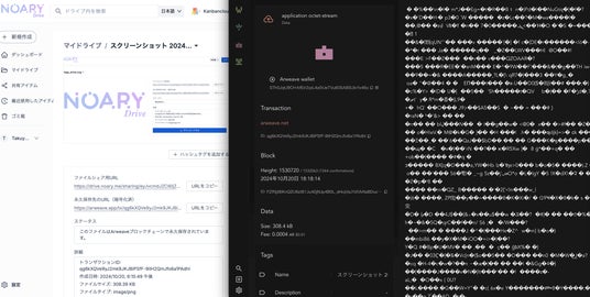 ・暗号化処理を行ってアップロードしたファイルについては、ブロックチェーン上からは復号しない限り閲覧できなくなりますので、万が一NOARYドライブがサービス終了する際は、サービス終了までにファイルを復号できるための必要な対応を行いますが、Arweaveの仕様変更等により完全にデータを復旧することができない場合があります。そのため、ユーザー様の方でも一度ノアリードライブから元ファイルをダウンロードしていただき、お手元にもファイルを置いていただくことでリスク分散が可能となります。暗号化処理をしない設定であれば本サービス終了後もブロックチェーンの方から直接ファイルを取得できますので、保存先のアドレスを控えていただきますようお願いいたします。