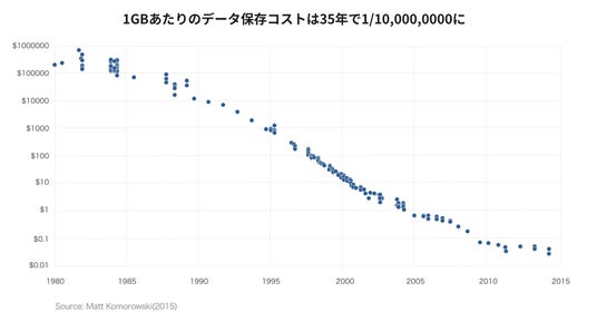 数十年前はたった1MBしか容量のないSDカードが何万円もしたように、データ保存にかかるコストは時間が経つにつれて劇的に安くなっています。