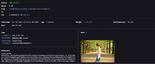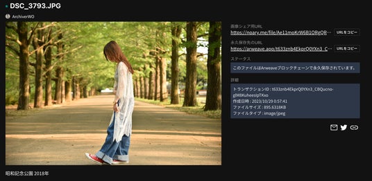 *画像だけでなくタイトルや概要などのメタデータもArweaveブロックチェーンに永久保存されています( https://viewblock.io/arweave/tx/t633znb4EkprQ0YXn3_CBQucno-glM8KuheesIpTKxo )