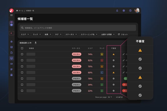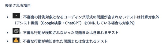近年ではエンジニア採用のコーディング試験において、AIを利用した不正行為が行われるケースが増えていますが、技術レベルを虚偽報告することは特に入社後のミスマッチに繋がります。今回リリースした「不審度検知」は、試験中のコピー&ペーストや別ページ・タブを閲覧することで発生する離脱などの不審行動を学習したAIが不審度を判定。レポート画面上で誰でもわかる形で可視化・確認できる機能です。