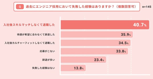しかし、エンジニア採用のミスマッチによって、教育コストやエージェントへの仲介手数料を考慮すると1件あたり500万円以上の損失(*2)が発生する場合もあり、逆に企業の負担が増すケースもあります。実際エンジニア採用担当者を対象とした調査では「過去にエンジニア採用において失敗した経験はあるか」について、最多の40.7%が「入社後スキルマッチせず退職した」と回答しています。(*3)