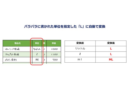 認識した結果を指定した文字に置き換えることができます。例えば、取引先ごとにバラバラの表記で送られてくる注文書の単位を統一させることができます。