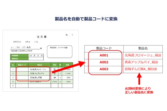 また、標準搭載している「AI類似変換」機能を利用することで、取引先特有の製品名を正しい名称へ変換することも可能です。取引先によっては「製品名A」を「製品 A」や「品名A」などと表記されていた場合でも、AI類似変換機能で自動的に正しい名称へ変換できます。