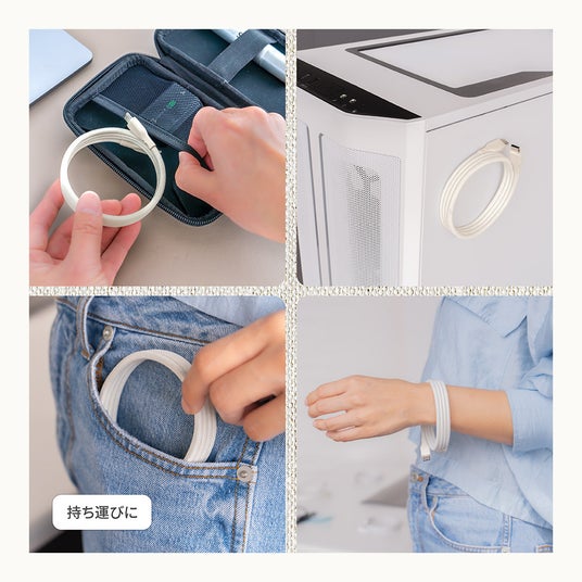 本製品は磁力で簡単にまとめられるマグネットケーブルです。ぐるぐると巻くだけでケーブルがまとめられるので、留め具を使わず形状記憶しているかのように収納できます。折りたたんでまとめる方法よりもケーブルへの負荷がかかりにくい点も特長です。
