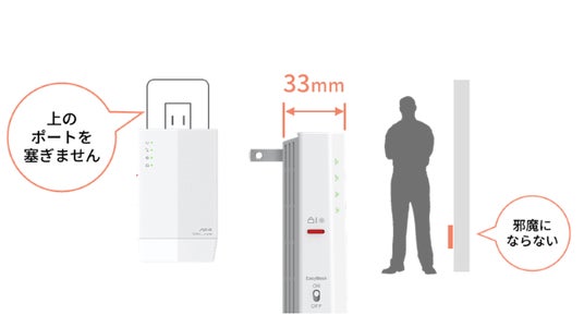 内蔵アンテナタイプの「WEX-3000AX4」はコンセントに直挿しして使用するため、廊下や階段の踊り場といったスペースの少ないところでもスマートに設置できます。