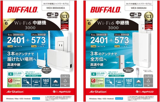 メルコホールディングス(東・名 6676)グループの株式会社バッファロー(本社:愛知県名古屋市、代表取締役社長:牧 寛之)は、Wi-Fi 6に対応し、3本の5GHzアンテナで遠距離での通信をより高速・安定化させるWi-Fi中継機2種を発売します。外付けアンテナタイプの「WEX-3000AX4EA」は2024年11月中旬、内蔵アンテナタイプの「WEX-3000AX4」は2024年11月下旬より順次出荷する予定です。