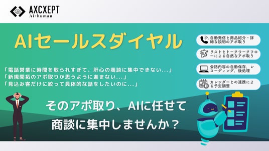Axcxept株式会社 - AI技術で効率的に商品説明からアポ取りまでを自動化する高度に自然な音声対話を実現する『AIセールスダイヤル』の試使用受付を開始