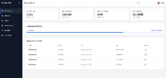 - リアルタイムダッシュボード: 通話状況、成約率、顧客反応などをリアルタイムで表示。