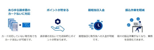 受け取った請求書をクレジットカードで支払えるサービスです。カード決済に対応していないお取引先の請求書も、本サービスを利用することでカードでの支払いが可能になります。お客様が指定する振込名義等、適切な振込名で期日までにお取引先様へ振り込みされ、カードのお支払い日に他のカードのご利用料金とまとめて引き落としされます。