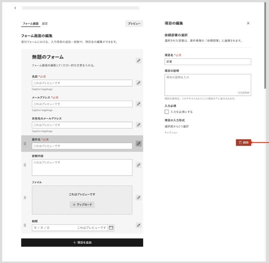 また、事業部担当者にとっても、法務相談やレビュー依頼時に伝えるべき情報を判別することができるようになり、業務負担が軽減されます。「案件受付フォーム」はテナントごとに最大50個の作成が可能です。また、作成された「案件受付フォーム」の項目を編集することも可能です。