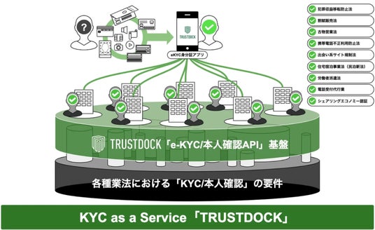 KYC as a Service「TRUSTDOCK」が提供している、デジタルIDウォレットとeKYC本人確認APIサービスでは、犯罪収益移転防止法をはじめ、携帯電話不正利用防止法、古物営業法、労働者派遣法、出会い系サイト規制法、民泊新法など、各種法律に準拠したKYCをAPI組み込みのみで実現します。