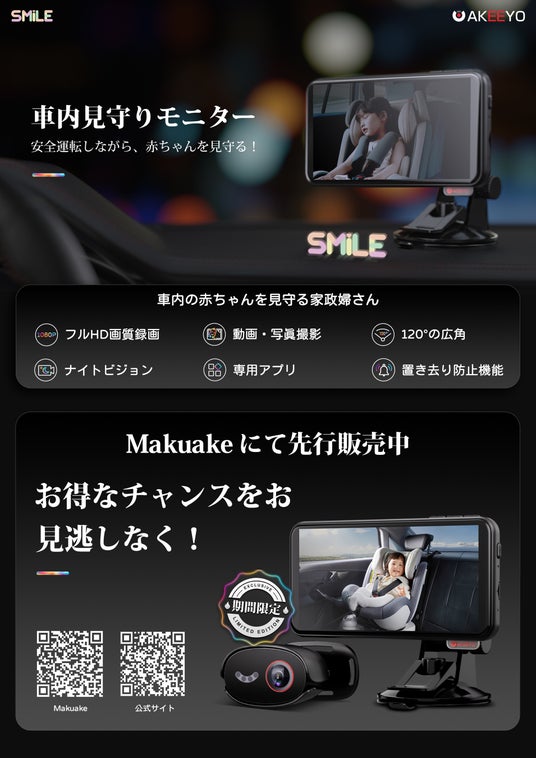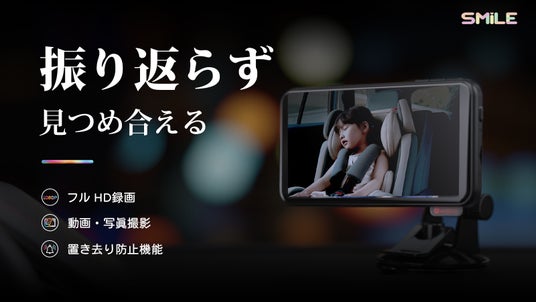 家族の命を守る安全運転を。 振り返らず、見つめ合える! 広角&昼も夜も鮮明に。車内見守りモニター『SMILE』