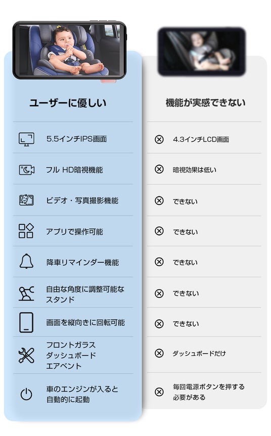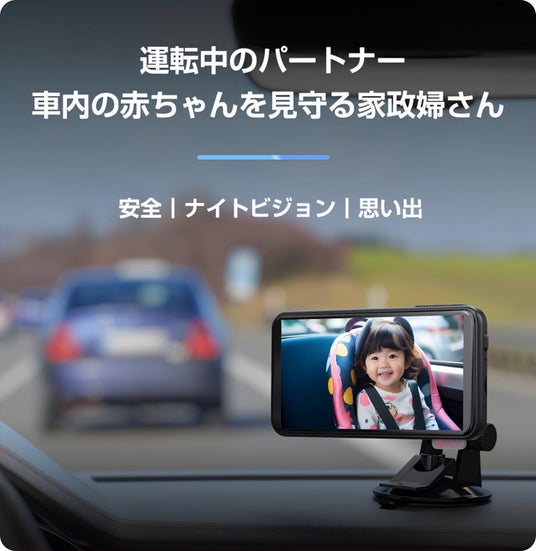 「我が家は子どもが産まれて、わんこを入れて5人家族になりました。準備もバタバタしやっと車に乗り込んだ時にこの見守りカメラで、はじめて赤ちゃんを確認出来た時は、とっても感動しました!安心感が違います!ずっとミラーを使っていたので見守りカメラだと、より鮮明に運転中、いつでも確認出来るのが、気持ちの余裕に繋がり安全運転が出来ます!
