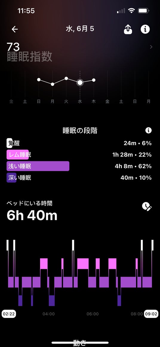 ・睡眠スコア: 総睡眠時間、安静時心拍数、休息の質などの要素に基づいており、深い睡眠、浅い睡眠、レム睡眠、覚醒状態を理解することができます。また、理想的な睡眠を促すためのアドバイスを提供することで生活習慣やストレス管理の改善をサポートし、質の高い睡眠を実現します。