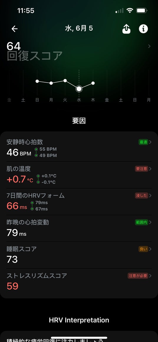 ・回復スコア: 心拍変動、皮膚温度、回復指数などを基に、体の回復状況を評価。、病気、トレーニング、ストレス、または睡眠不足など、体の状態が変化する要因を理解するのに役立ち、健康管理や生活の質向上をサポートします。