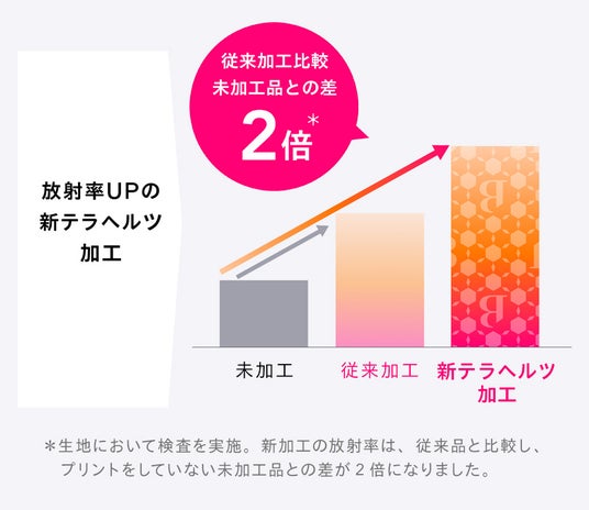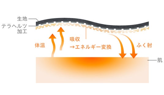 1秒間に1兆回振動する電磁波「テラヘルツ波」を放出するプリントが、体温を吸収して遠赤外線エネルギーに変換し、ふく射することで血行を促進します。