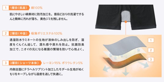 おりものなどの汚れが落ちやすい防汚加工で、黄色ジミ残りなし。少量の液体のしみ出しを防ぎながら湿度を逃すから、蒸れずにさらりと快適です。抗菌防臭加工でニオイ対策も。