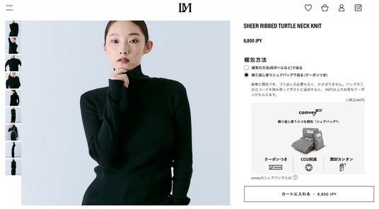 株式会社comvey(コンベイ、本社:東京都中央区、代表取締役:梶田伸吾)は、1751年創業の繊維商社 タキヒヨー株式会社(本社:名古屋市西区、代表取締役 社長執行役員:滝 一夫)が展開するオリジナルブランド「LAEMUSE(ラエミューズ)」公式オンラインストア( https://laemuse.online/ )に、繰り返し使うエコな梱包材「シェアバッグ(R)︎」およびオペレーションシステムが導入されたことをお知らせ致します。本サービスの導入により、配送で発生する梱包ゴミを最小限に抑え、ダンボール回収やゴミ焼却時に発生するCO2を削減し、脱炭素化を推進することが可能となります。