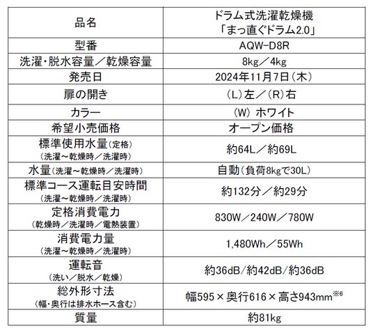アクア株式会社(本社:東京都中央区、代表取締役社長 兼 CEO:杜 鏡国)は、60×60cmの防水パン(※1)に置けるコンパクト&大容量が特長のドラム式洗濯乾燥機「まっ直ぐドラム2.0シリーズ」の8kgタイプ、AQW-D8Rを2024年11月7日(木)より発売いたします。