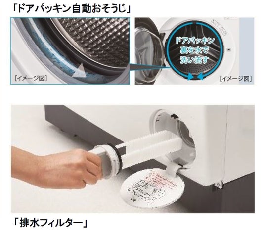 洗濯運転前と乾燥運転中にシャワー水とゴムワイパーで糸くず・ホコリを自動でおそうじするから、面倒な乾燥フィルターのお手入れを軽減。洗濯のたびに洗濯槽の裏側も除菌(※3)&黒カビを抑制(※4)する「カビケア槽自動おそうじ」(※5)や、ドラム内を乾燥して黒カビの原因となる水分を取り除く「槽乾燥コース」、パッキンの溝深くに残った糸くずや洗剤の泡を水で洗い流す「ドアパッキン自動おそうじ」など、手間のかかるお手入れをおまかせできる便利な機能が備わっています。