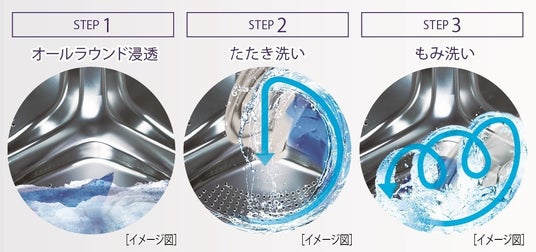 まっ直ぐドラムが回転と静止を繰り返し、高濃度洗剤液を衣類全体に素早く浸透。さらに衣類を高く持ち上げて落とす「たたき洗い」、とドラム壁面を使って手洗いのようにムラなくキレイに「もみ洗い」を行います。